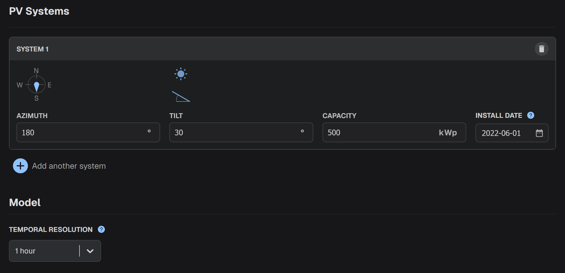 - Tilt: the inclination of the PV panels. It should be in degree values between 0 and 90 (0-parallel, 90-perpendicular to ground).