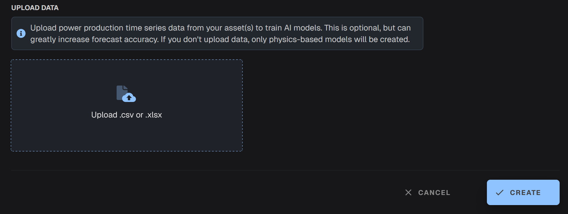 Upload historical generation or demand data to train ML models. For wind or solar sites this is an optional step. If no power generation data are uploaded, then only physical models can be deployed. For better performance of the ML models, the power measurements are recommended to have hourly or sub-hourly resolution. The platform accepts CSV or Excel files.