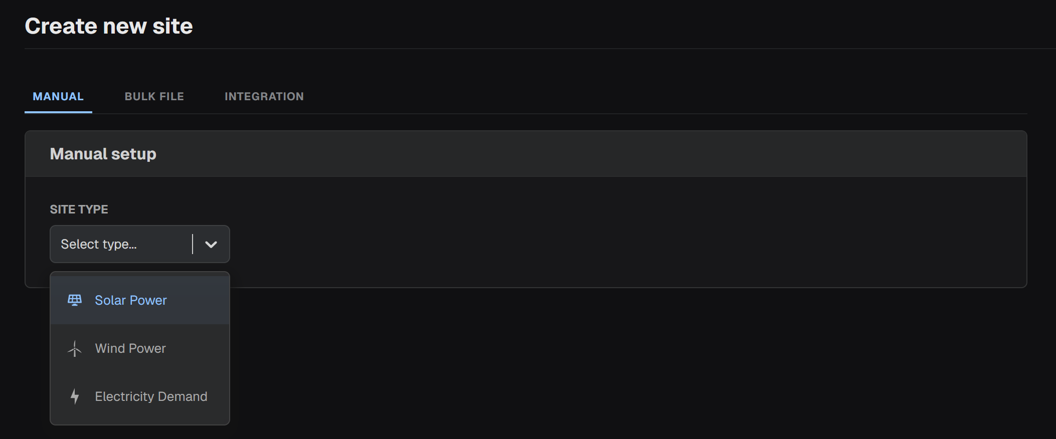 In the following page, choose the type of the new site. Currently, three (3) site types are supported: Solar Power, Wind Power and Electricity Demand.